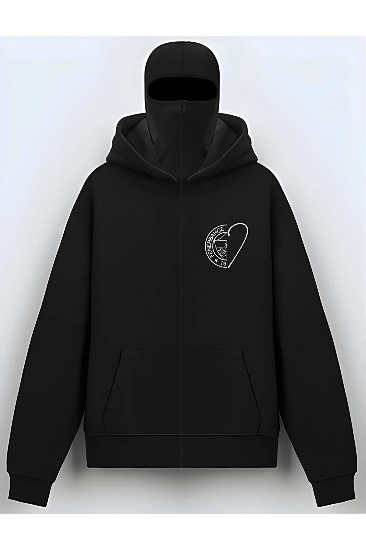 هودي أسود واسع وسميك ومريح، مصمم خصيصاً لمشجعي نادي فنربخشة التركي (Fenerbahçe S.K.). الميزة البارزة هي القلنسوة/قناع الوجه (بالاكلافا) كامل التغطية الذي يغلق بسحاب ليغطي الرقبة والجزء السفلي من الوجه بالكامل، تاركًا منطقة العينين فقط مكشوفة، مما يوفر حماية فائقة من البرد. يزين الجزء الأمامي رسم على شكل قلب باللون الأبيض يدمج شعار فنربخشة الرسمي و عام التأسيس ‘1907’. يتميز هذا الهودي بـ جيب كنغر أمامي كبير، وأربطة قلنسوة قابلة للتعديل، وأطراف أكمام وحافة سفلية مضلعة، مما يجعله مثالياً لإظهار الروح الرياضية بأسلوب حضري وعصري.